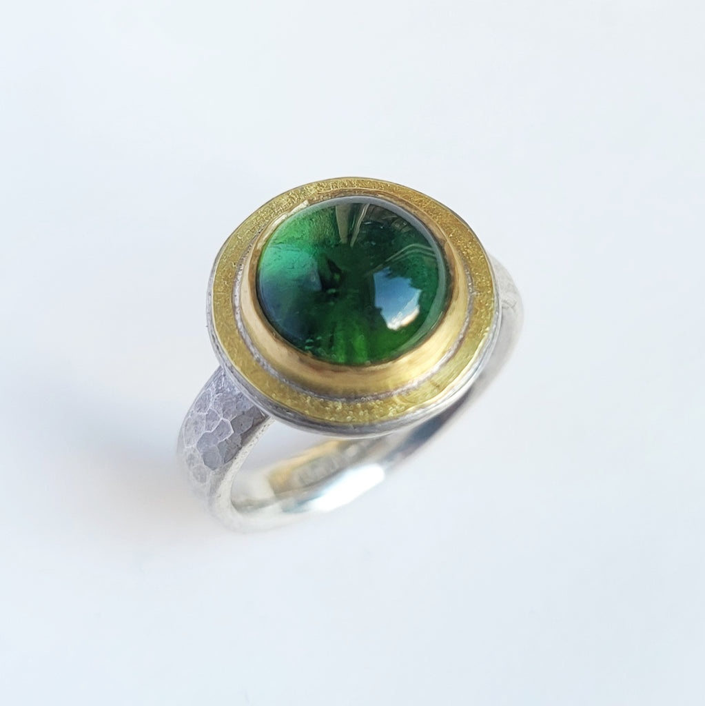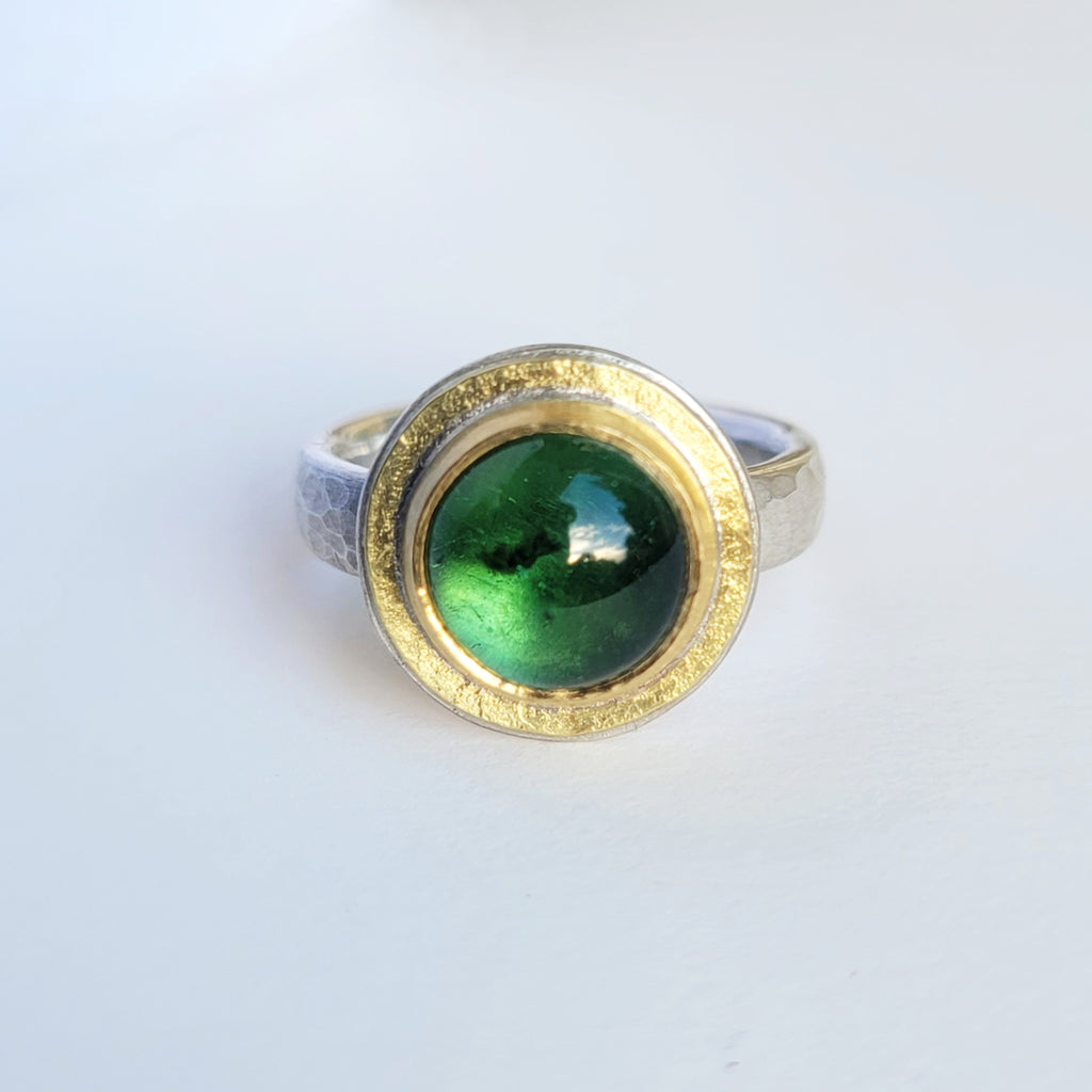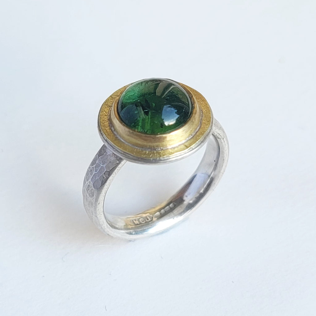 I love a tourmaline and this one is a beautiful rich green. It's set in a lovely buttery 18 carat yellow gold with a hammered texture surround. It's on a 4 mm oval hammered silver band.