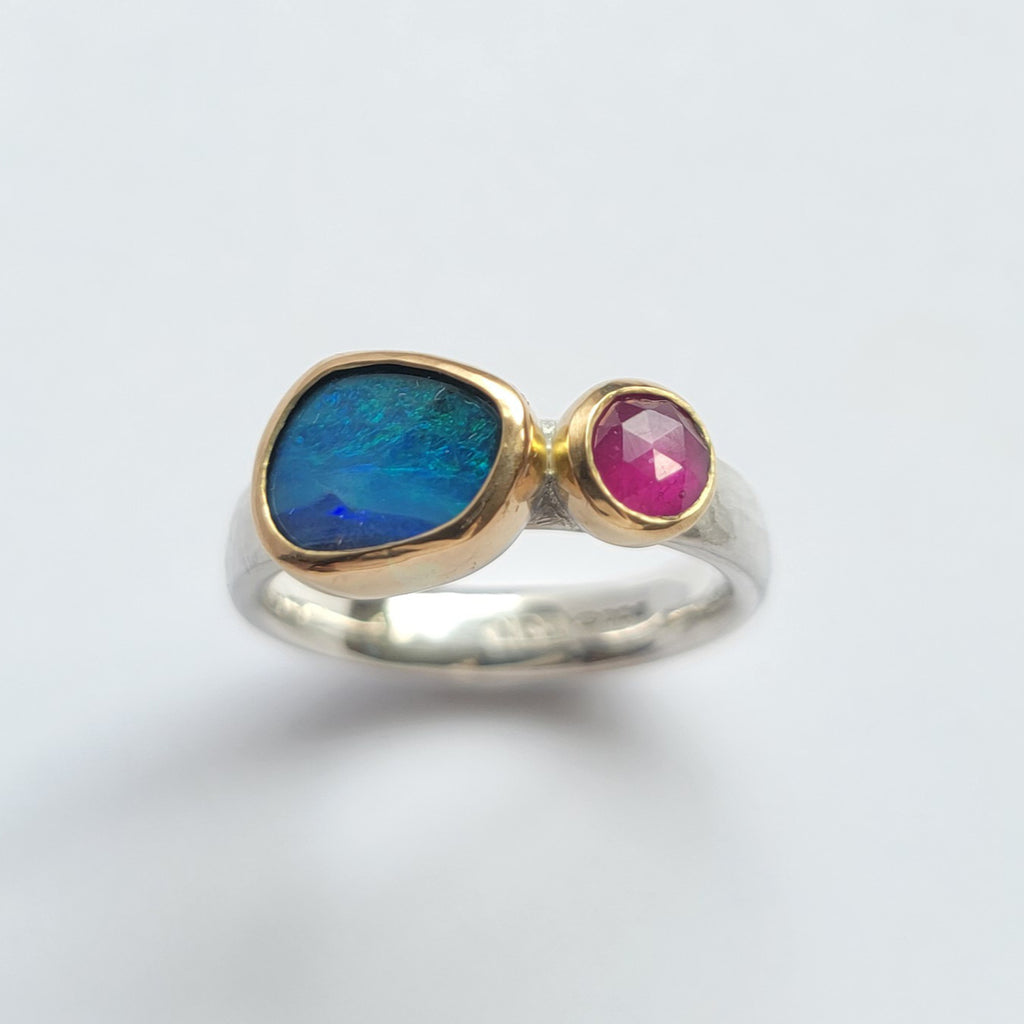 I'm sure I can see a mountainous landscape in the many shades of blue and turquoise of this fabulous Australian boulder opal. I have paired it with a rose cut ruby, both set in 18 carat gold on a hammered 4 mm silver band.