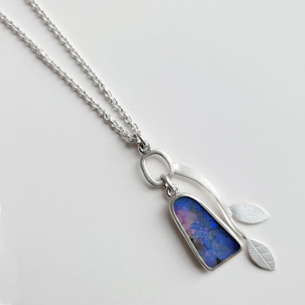 This lovely Australian boulder opal has shades of purple and lilac with blue flashes (very similar colours to my Rock pool ring!) There are imprints of rubber leaf, dusty miller and sycamore seed on the reverse. The trace chain can be worn at either 16 or 21 inches and has a handmade hook clasp.