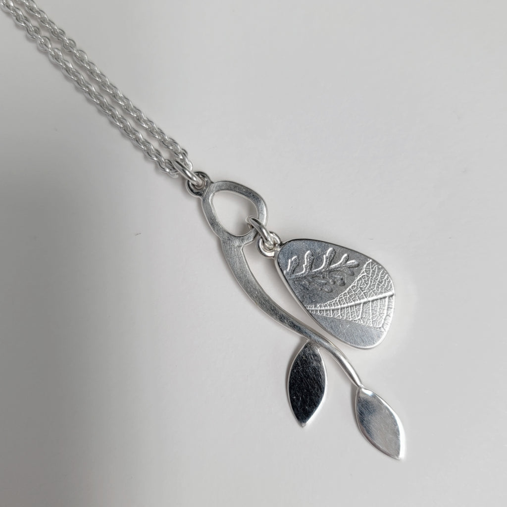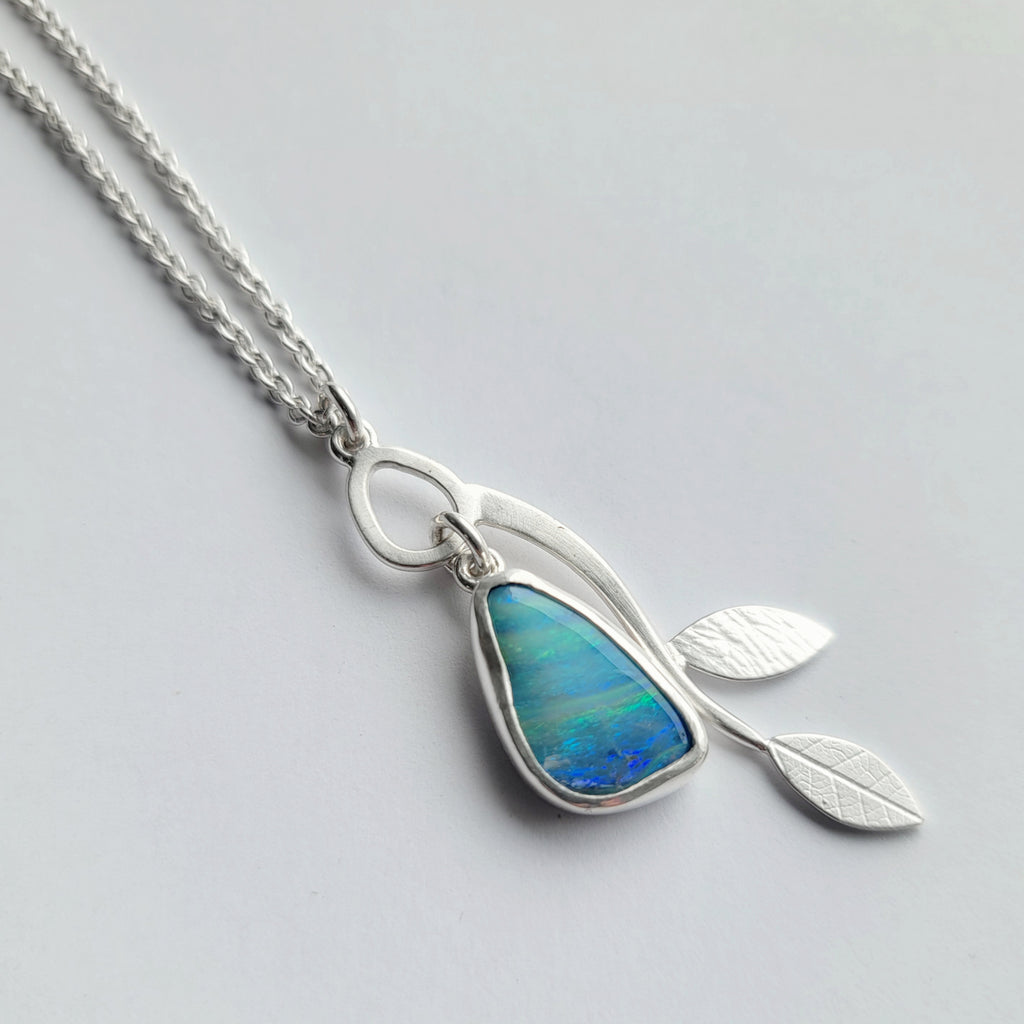 Occasionally I come across these stripey Australian opals and I really love them. This one has shades of turquoise and blue with bright flashes running through in places- gorgeous! It's set in silver with leaf and dusty miller fern imprints on the reverse. The chain has 2 attachment points so can be worn at either 16 or 20 inches.