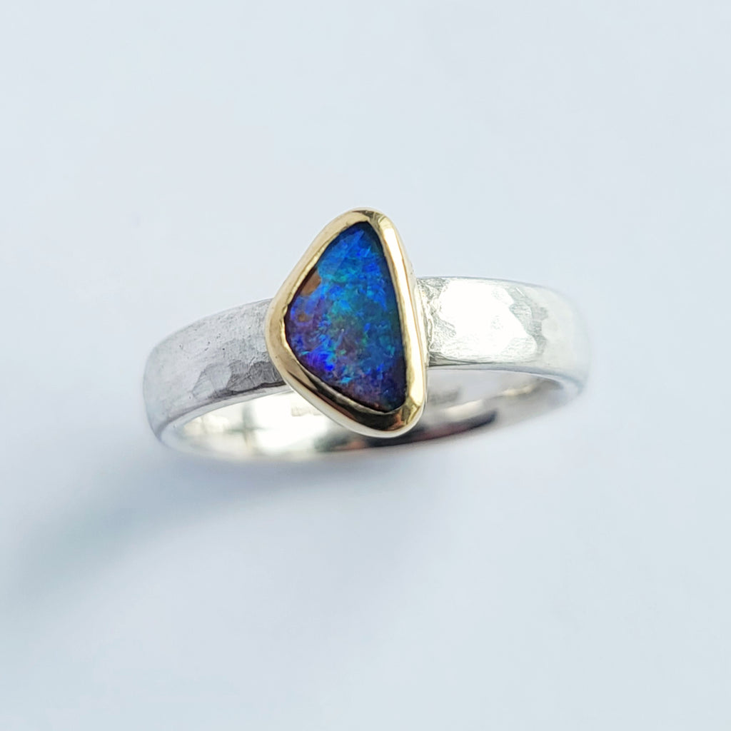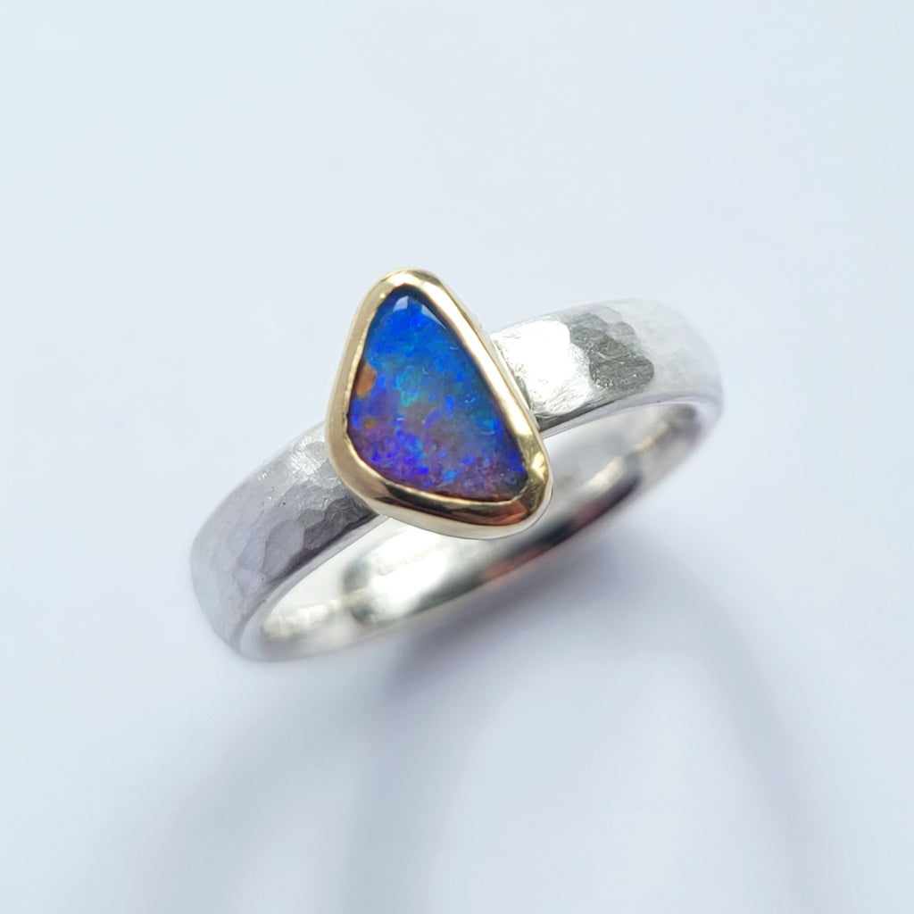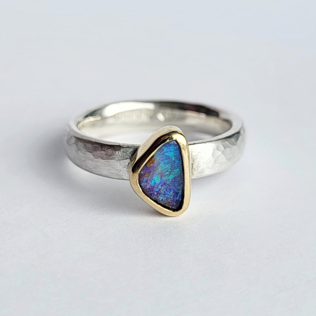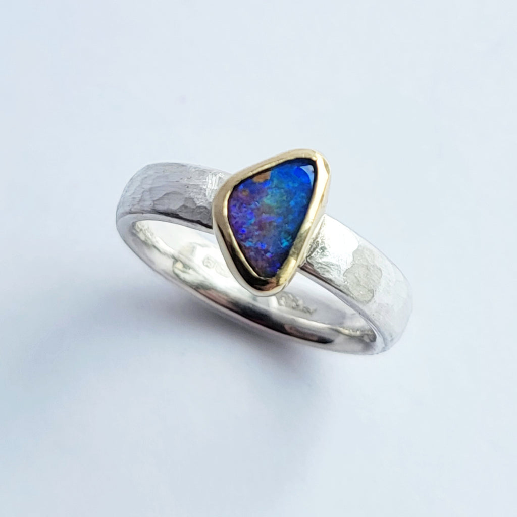 A fairly small opal packing a lot of punch! It has beautiful luminous purple, green and blue flecks and a real depth to the opal. I've tried hard to capture the life in the photos! It is set in 18 carat yellow gold on a silver hammered band.